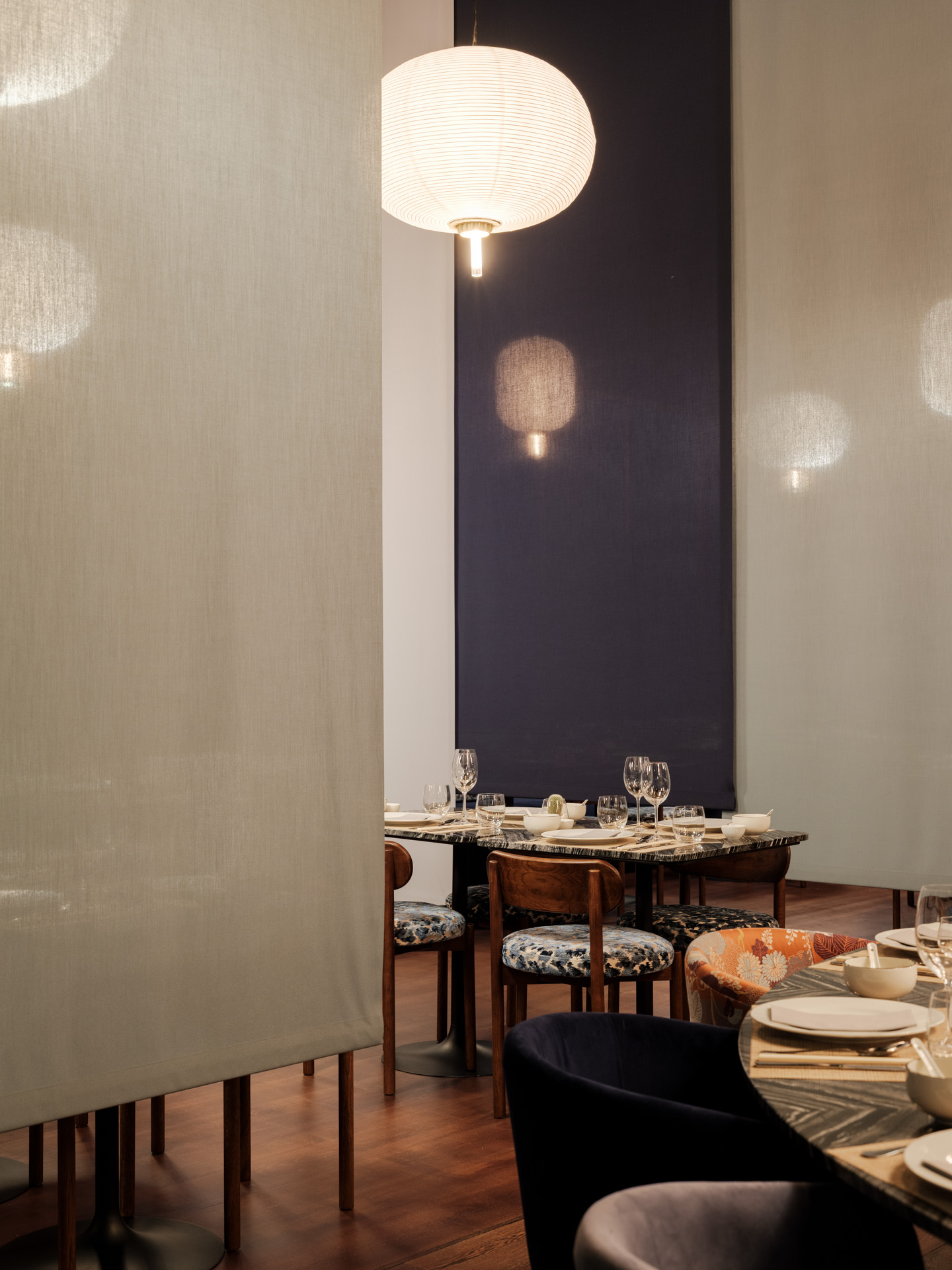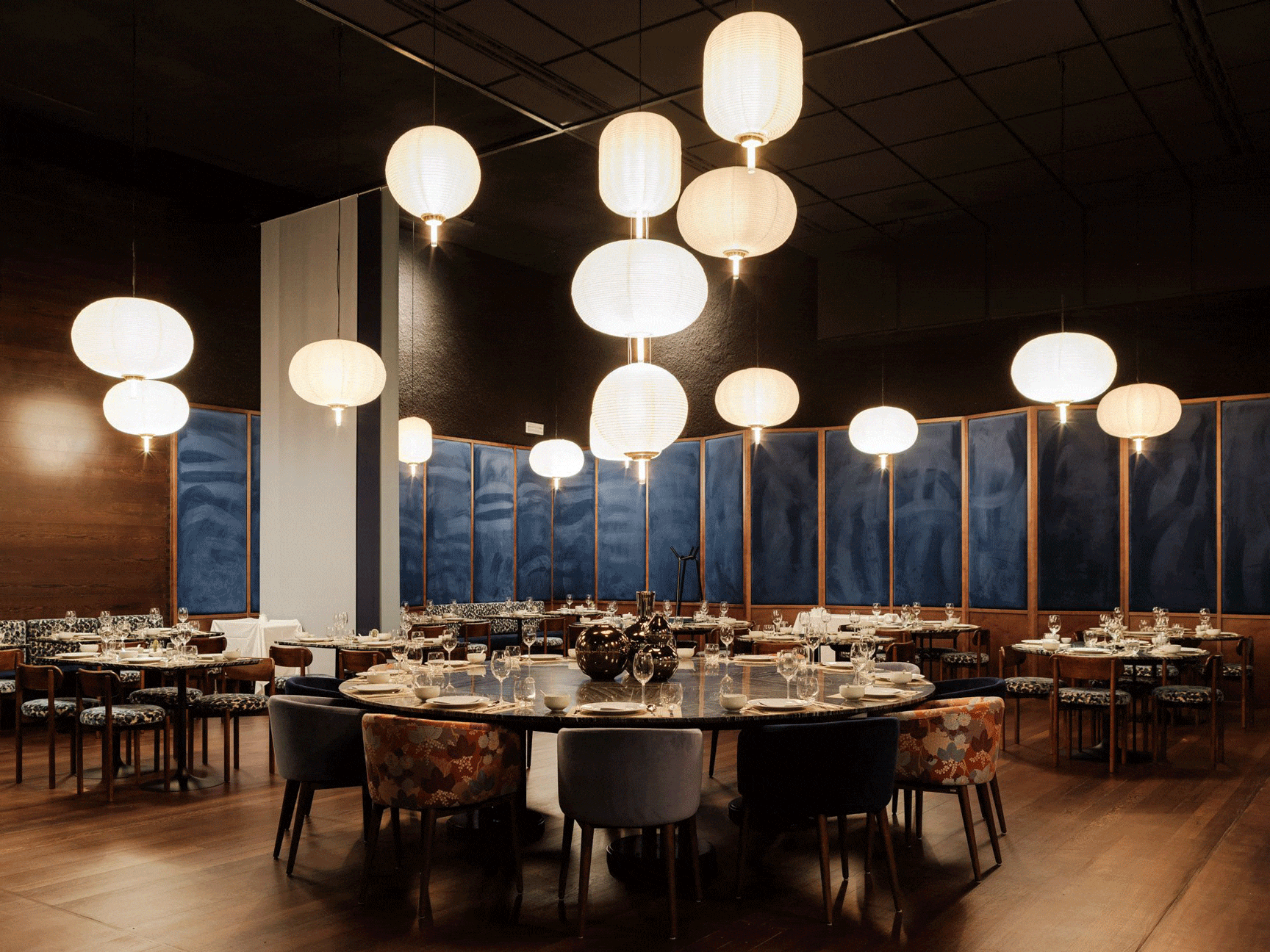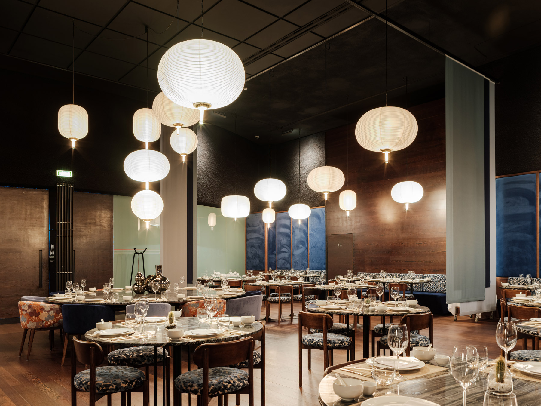 In the organisation of the space, a system consisting of four lines of sliding curtains allows for real-time management of multiple privacy configurations, from the large room to small private spaces. And it is even possible to transform the large central table into a private room, a magic trick that can be performed in a matter of minutes.