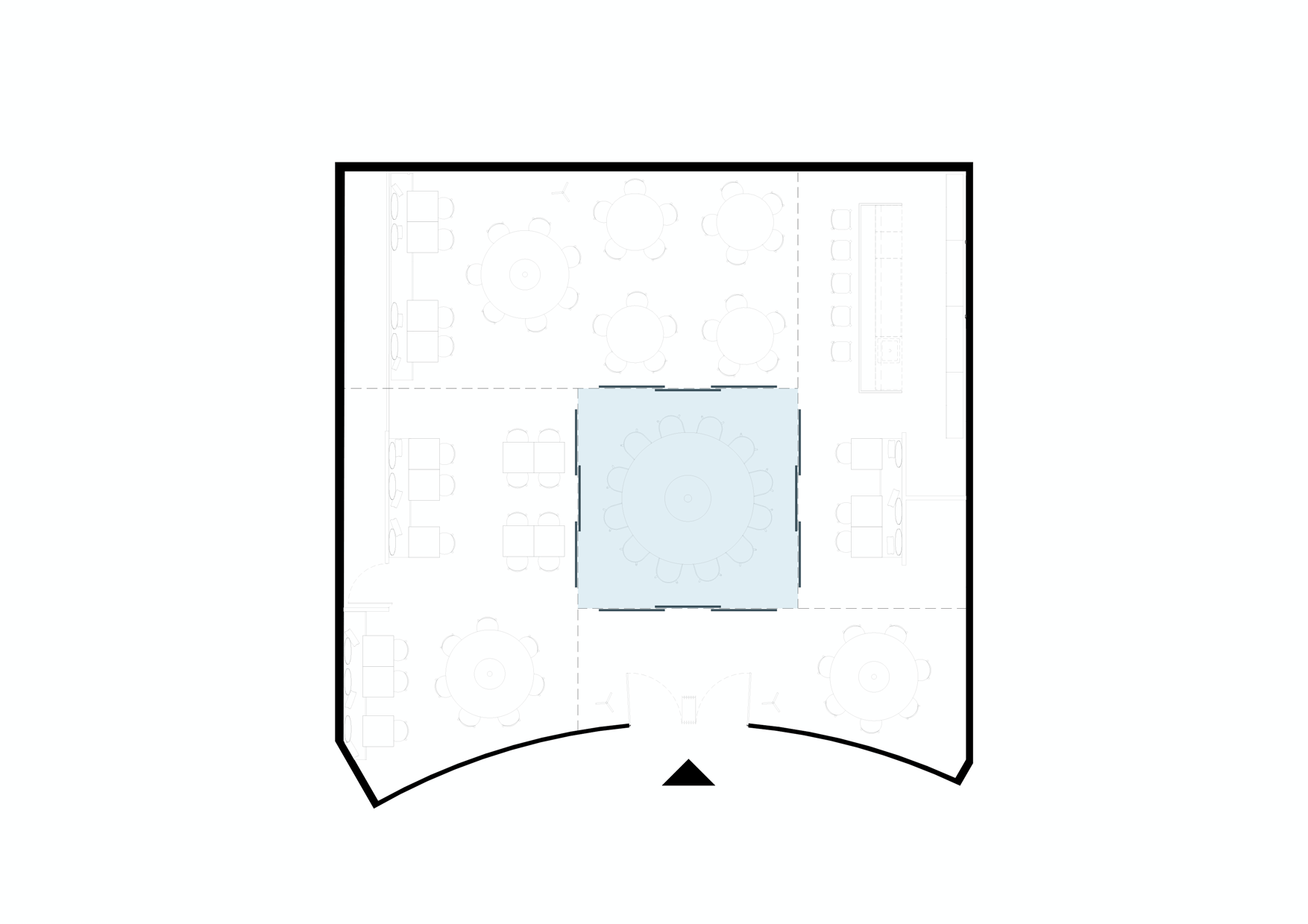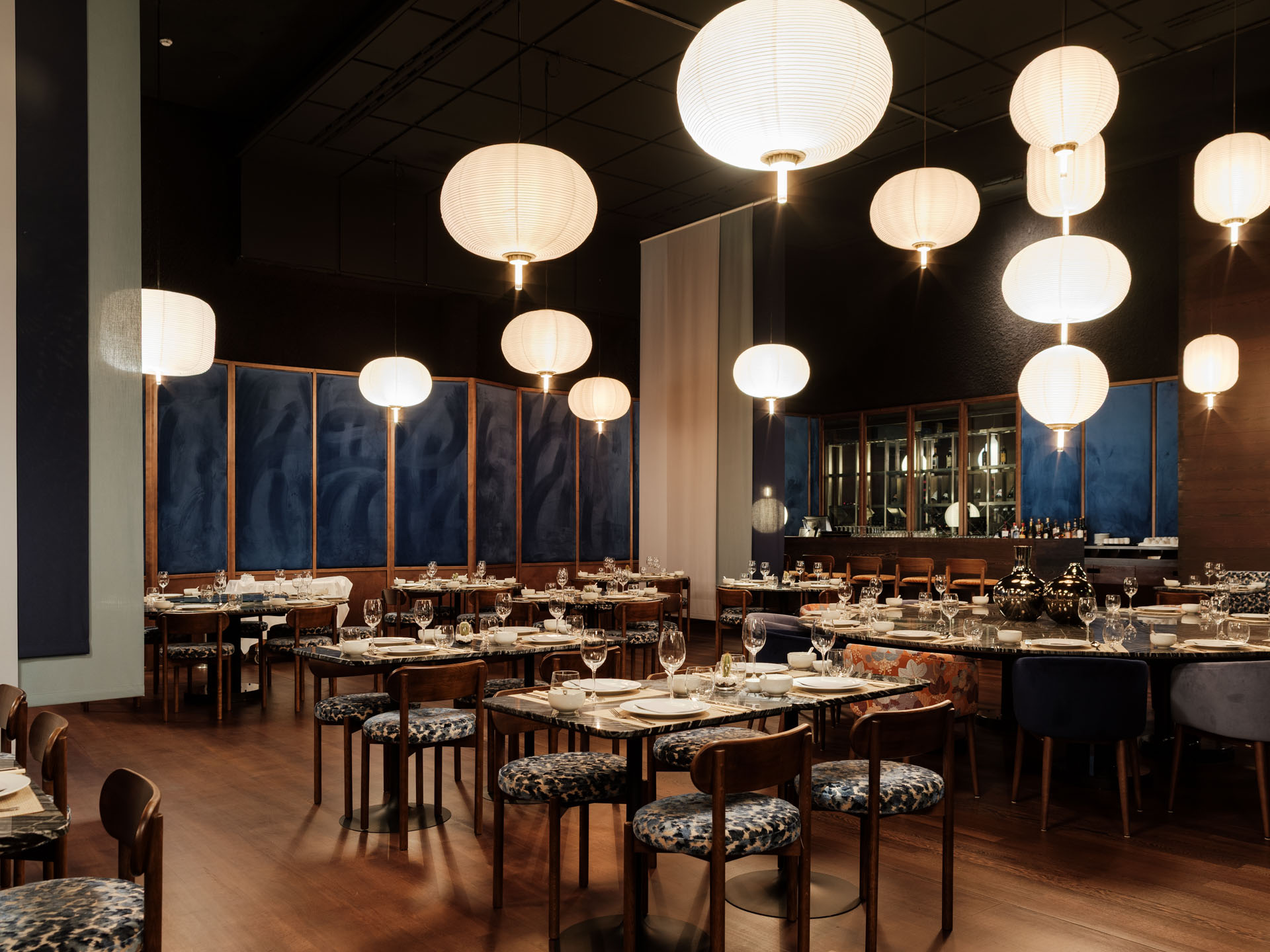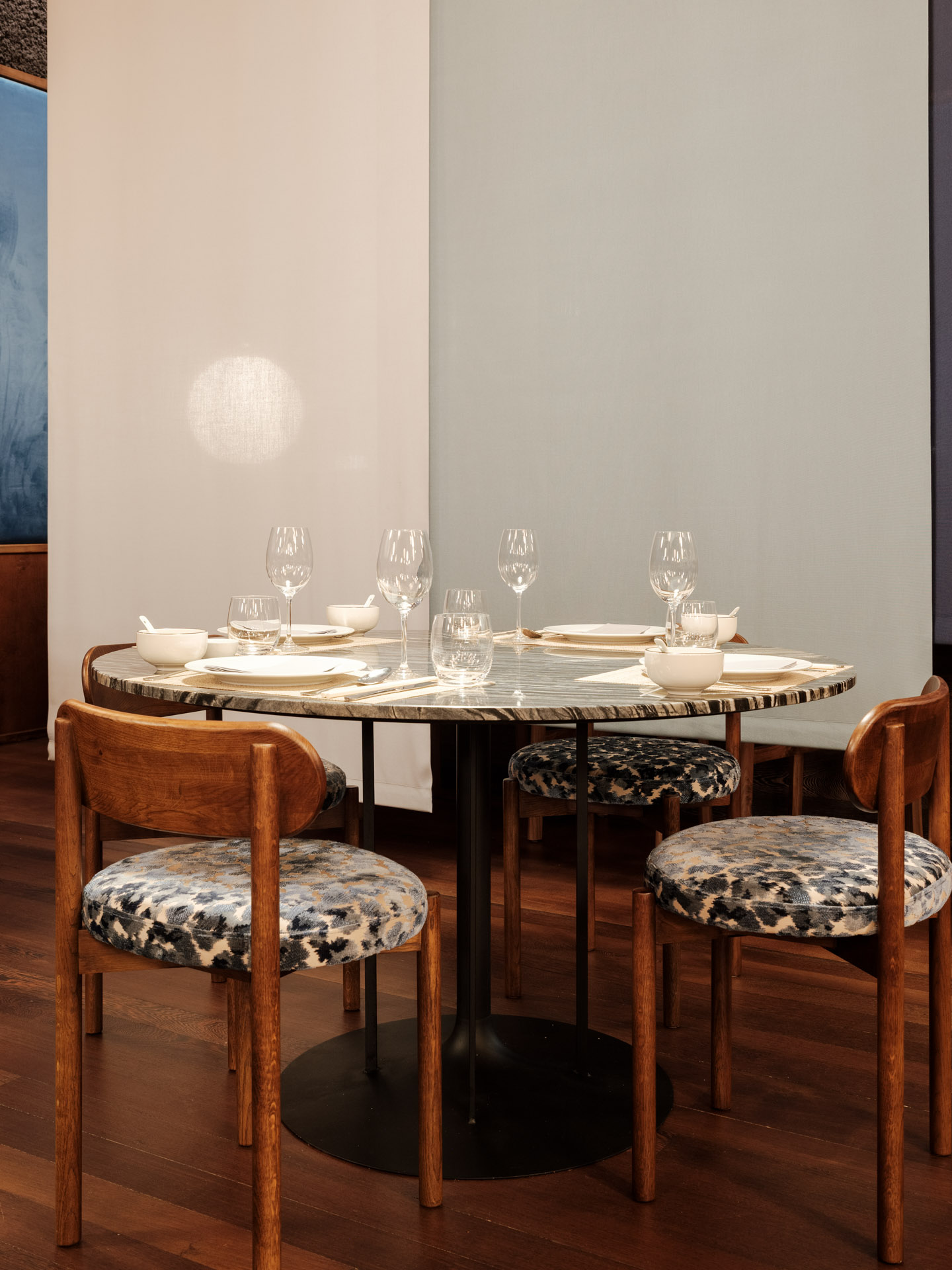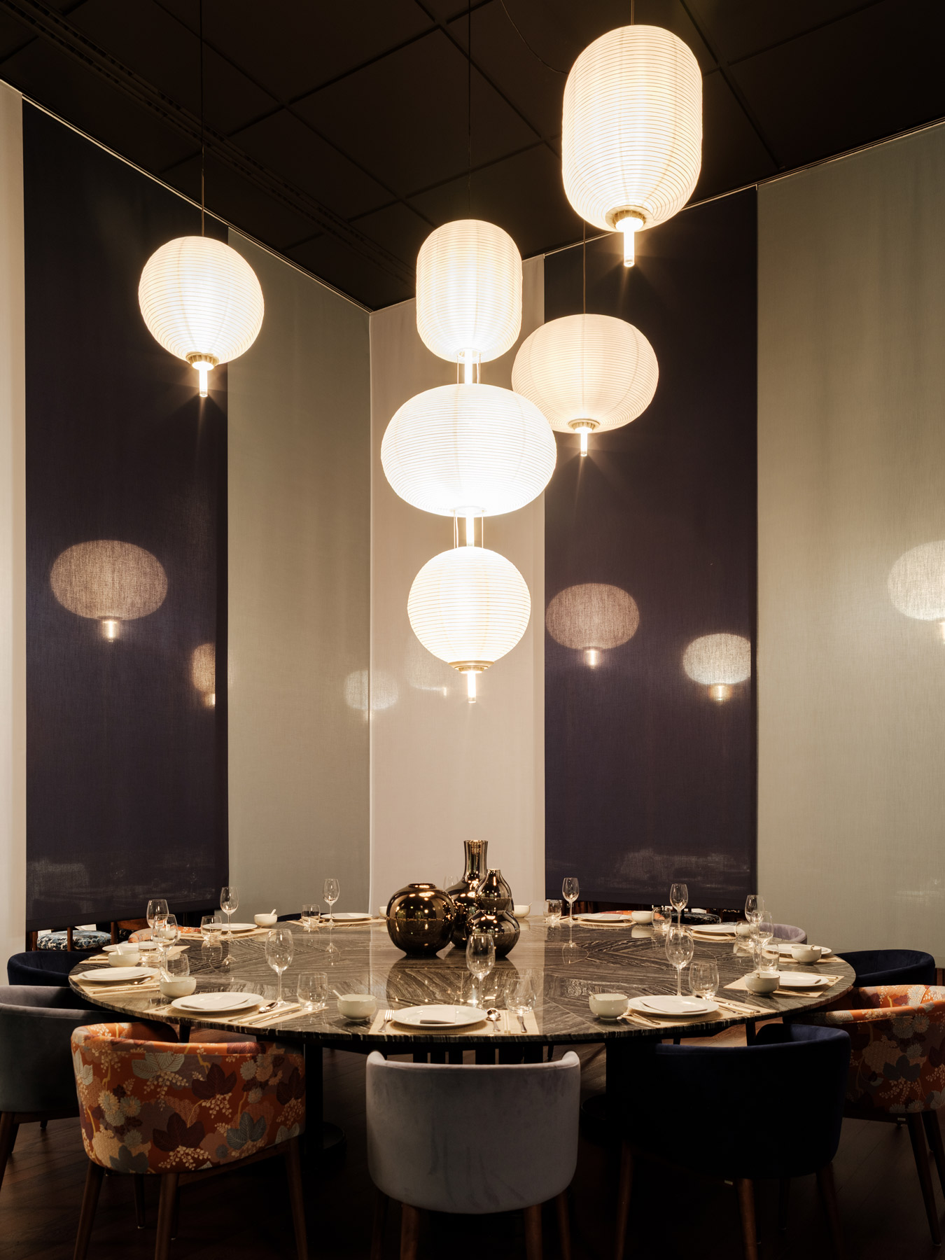 In the organisation of the space, a system consisting of four lines of sliding curtains allows for real-time management of multiple privacy configurations, from the large room to small private spaces. And it is even possible to transform the large central table into a private room, a magic trick that can be performed in a matter of minutes.